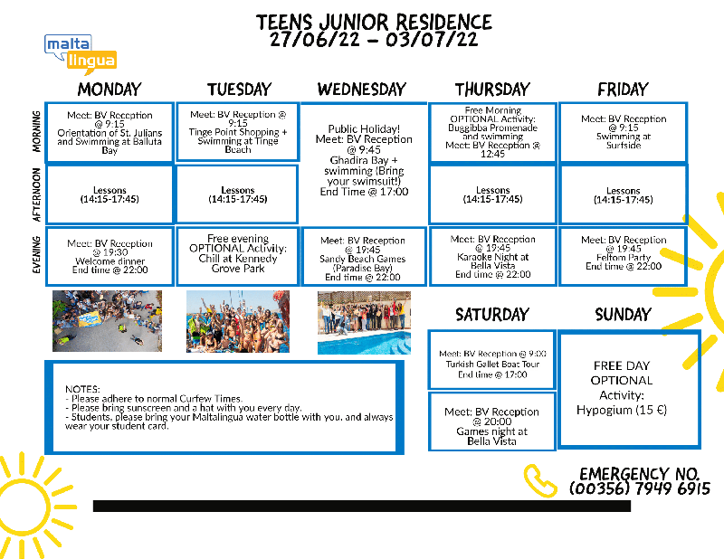 Découvrez votre programme d'activités ci-dessous !Programme d'étéSemaine 4 (27 juin 2022 - 3 juillet 2022)Résidence Junior - AdolescentsSemaine 4 (27 juin 2022 - 3 juillet 2022)Famille d'accueil - Adolescents